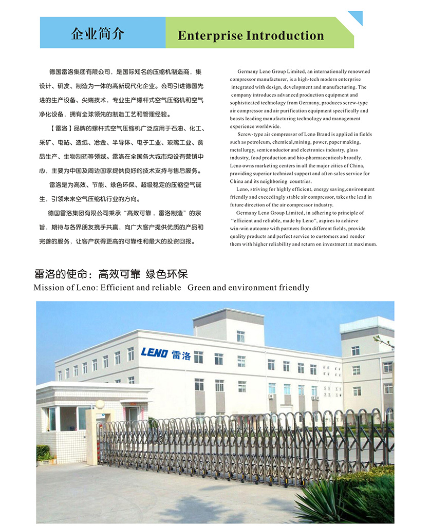 雷洛(LENO)是全球公认最杰出的空气系统解决方案供应商。自1960年开始生产制造工业用空气压缩机,现已发展成为全球最知名的压缩机制造商之一,可为用户提供各种空气压缩机及配套设备。我们基于客户的各种不同需求持续创新,在空气压缩机系统设备、汽车制造、粮油食品配套、矿山工程机械设备等领域都确立了领先地位。目前,我们的产品和解决方案已经应用于全球100多个国家和地区,服务全球不同的工业领域。雷洛公司致力于发展覆盖全球的销售和服务网络,于2012年成立了雷洛压缩机(成都)有限公司,负责亚太地区的产品研发、生产、销售,重点为中国及周边地区和国家提供良好的销售支持与技术服务。雷洛压缩机(成都)有限公司在成都龙岗区有占地400亩的生产基地,专业生产全无油螺杆压缩机,无油水润滑螺杆空压机及空气后处理设备。作为雷洛压缩机在亚太地区的销售及制造基地,雷洛集团引进德国雷洛集团最新技术和国际先进的质量管理体系,开发并制造高效、节能、优质的空气压缩机系统设备。 雷洛压缩机(成都)有限公司在全球设立有上百个销售和服务机构,在中国十一大区域都设有办事处,同时都有备品备件仓库,确保为用户提供及时、快捷、优质的售前、售中、售后服务。产品在国内市场占有率节节上升,“雷洛”品牌已深入人心。 雷洛压缩机(成都)有限公司的质量方针:雷洛就是质量!雷洛就是服务! 德国雷洛集团有限公司技术方针:不断创新,让产品更加高效可靠! 成都雷洛科技有限公司 营理念:让用户获得最好的使用体验以及最高的投资回报!